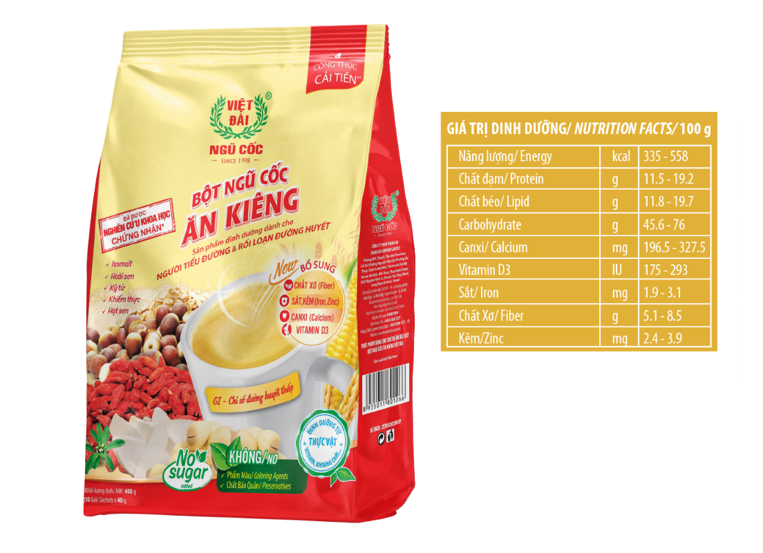 - Ngũ cốc Việt Đài dinh dưỡng 500g không chứa các chất hóa học độc hại, gồm nguyên liệu có nguồn gốc tự nhiên, đảm bảo an toàn vệ sinh thực phẩm và cung cấp nhiều chất dinh dưỡng.