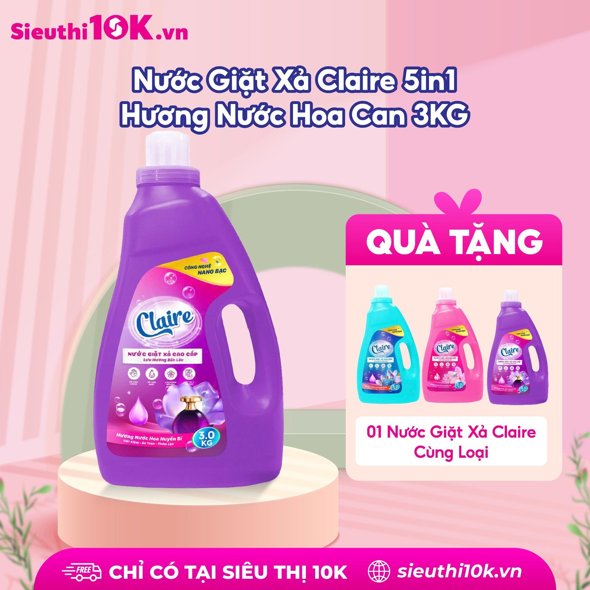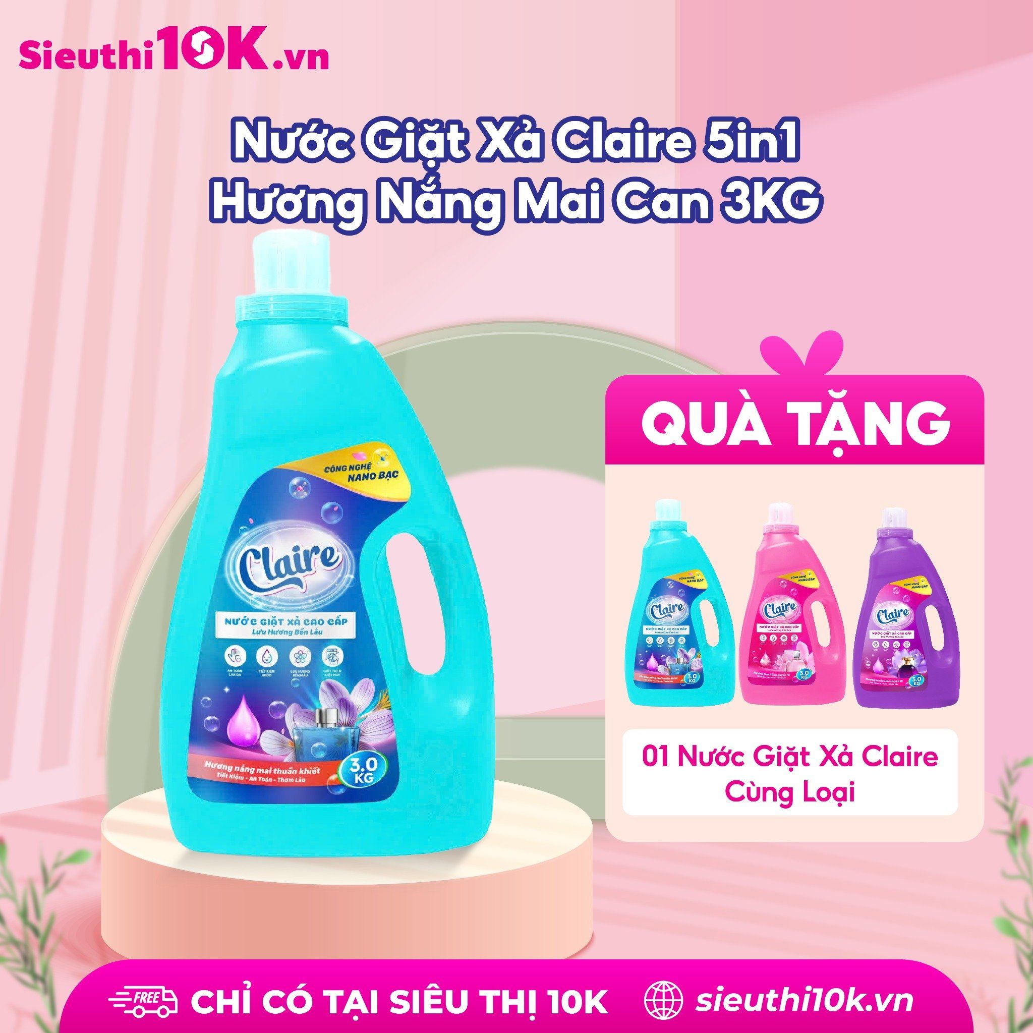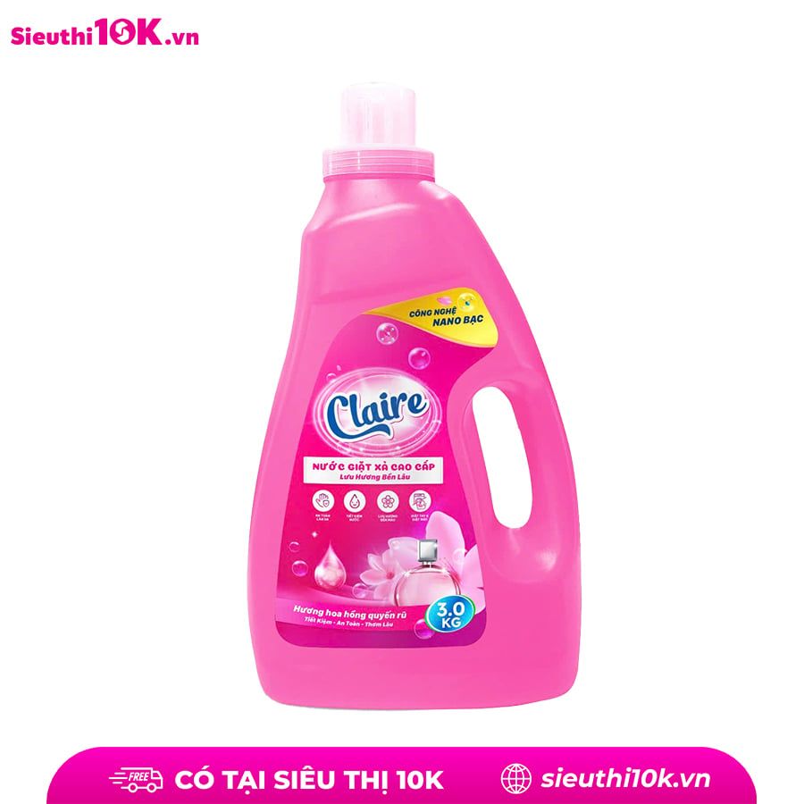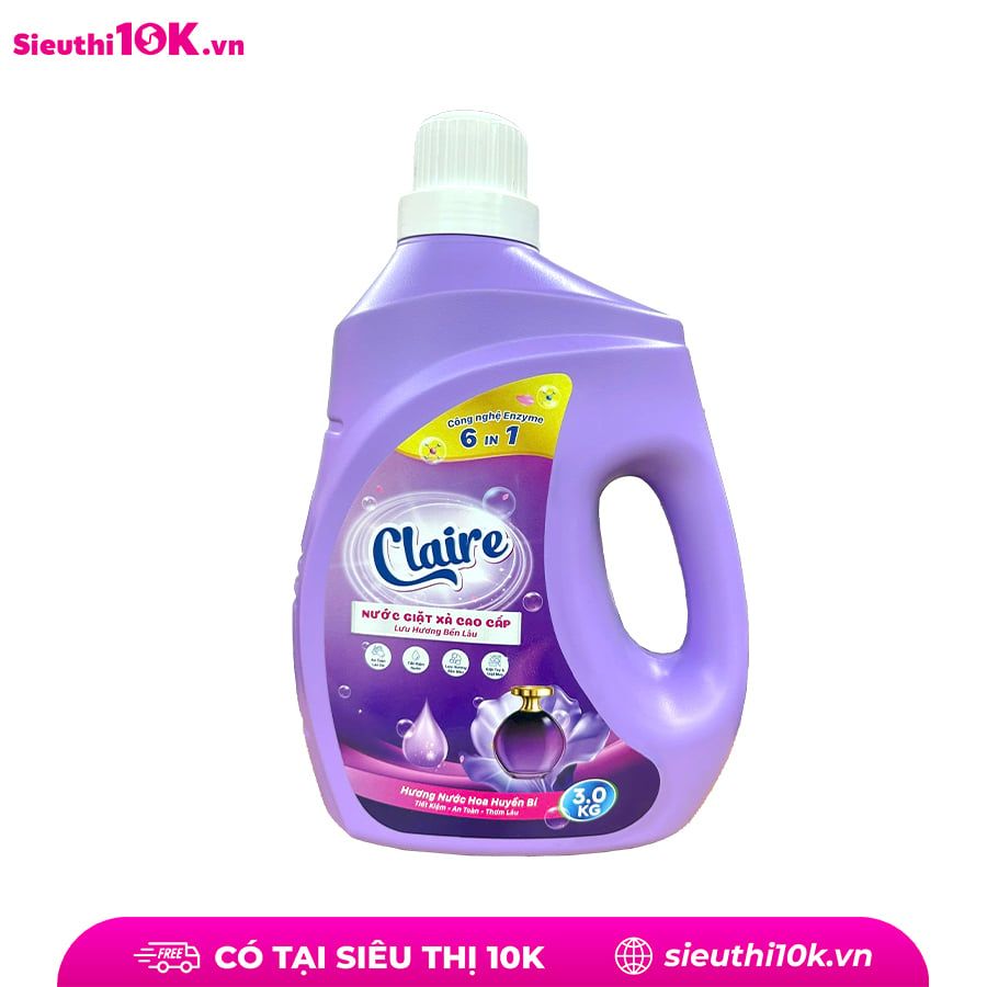 Tên sản phẩm: Nước Giặt Xả Claire 5in1 3kg Thành phần: Nước, Sodium Laureth Sufate, Sodium Lauryl benzene suffonate (Las), HEC-Hydroxy etyl celluto, Sodium tripolu phosphat, màu, hương, Nano Bạc,.... Nguyên liệu nhập khẩu từ Pháp. Nước giặt Clair là sản phẩm sản xuất theo công thức độc quyền, phân phối độc quyền tại hệ thống của Miniti. Không thể mua được ở bất cứ đâu. Được sản xuất theo công nghệ Nano Bạc: Công dụng: – Giúp tăng hiệu quả giặt giũ quần áo. – Giảm nguồn năng lượng tiêu thụ do những sản phẩm nước giặt xả này có thể giặt ở nhiệt độ thấp. – Tiết kiệm thời gian giặt giũ do hiệu quả phân huỷ vết bẩn dễ dàng. – Tiết kiệm nước do quá trình giặt giũ nhanh chóng. – Giảm tác động đến môi trường vì những enzyme này có khả năng phân huỷ sinh học. – Tăng độ trắng sáng và chống các chất bẩn bám trở lại trên quần áo. – Làm mới, giữ màu quần áo nhờ tác dụng của enzyme xenllulaza. – An toàn tuyệt đối cho da nhạy cảm, da trẻ nhỏ. Hướng dẫn sử dụng: Giặt tay: - Xả quần áo qua với nước sạch trước - Hòa tan 1 lượng vừa đủ nước giặt Claire trong 3-4 lít nước sạch. - Ngâm quần áo từ 10-15 phút - Vò, xả vải vài lần bằng nước sạch Giặt máy: Dùng 1-3 nắp tùy lượng quần áo cần giặt Chú ý: - Rửa tay sau khi sử dụng sản phẩm - Để tránh xa tầm tay trẻ em - Bảo quản sản phẩm ở nơi thoáng mát
