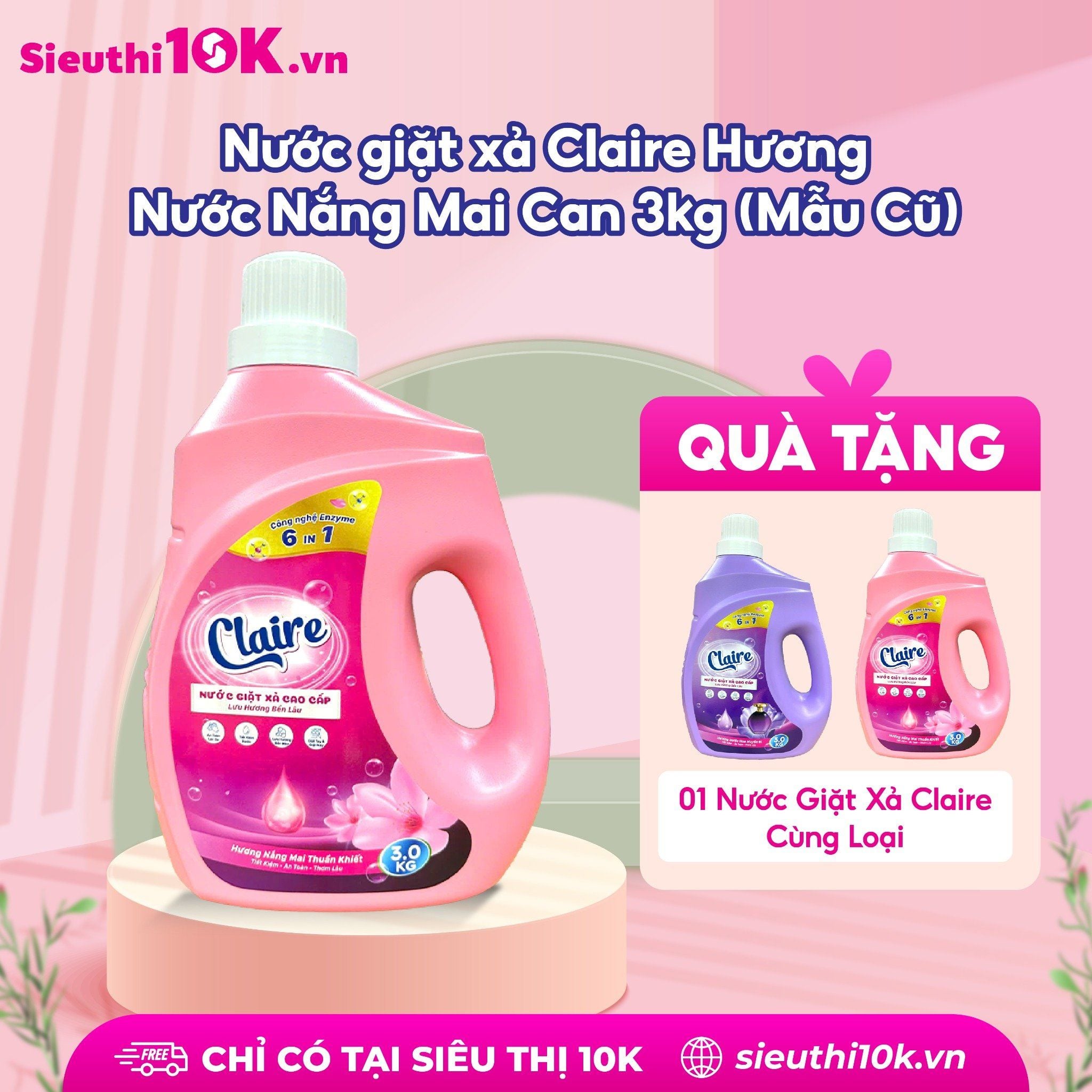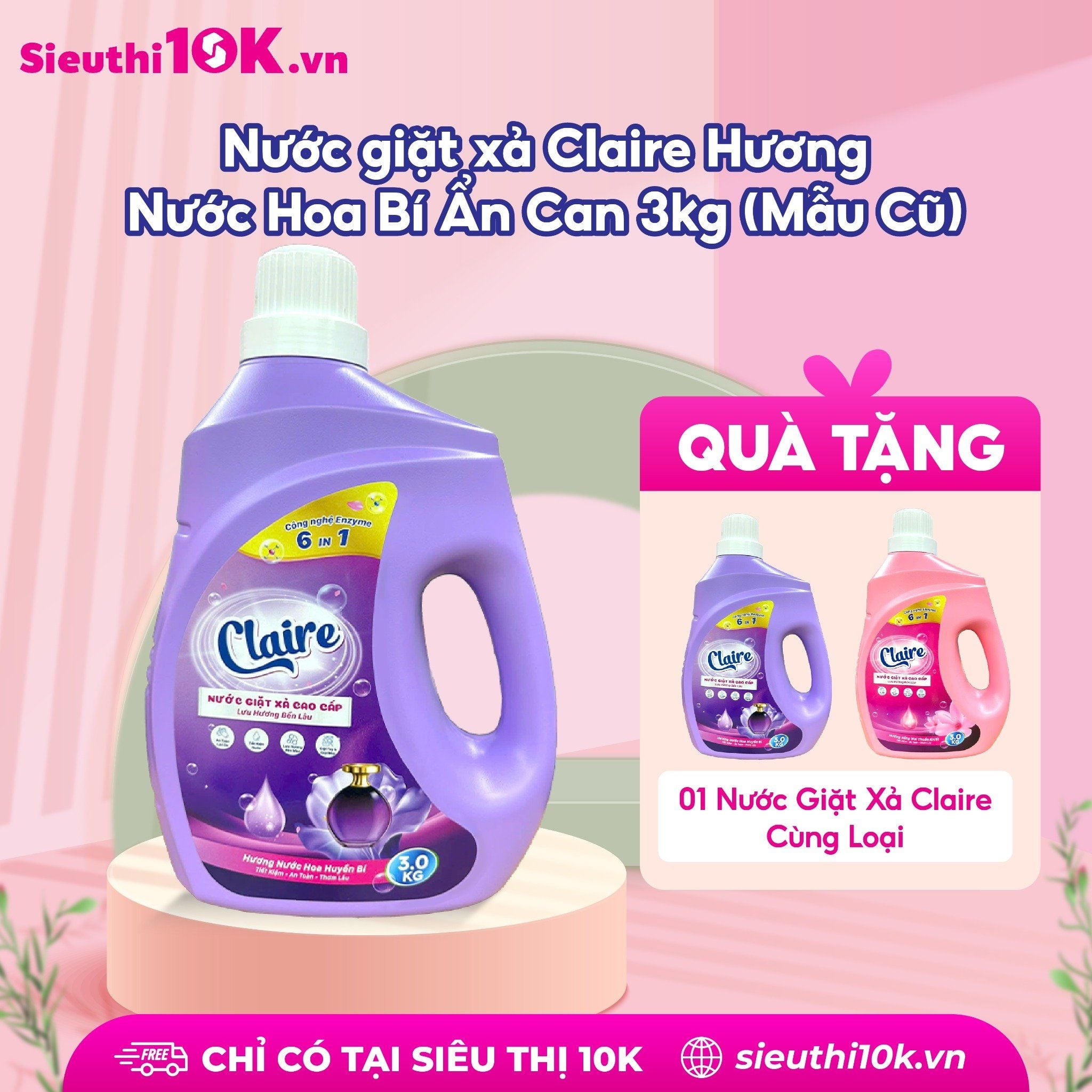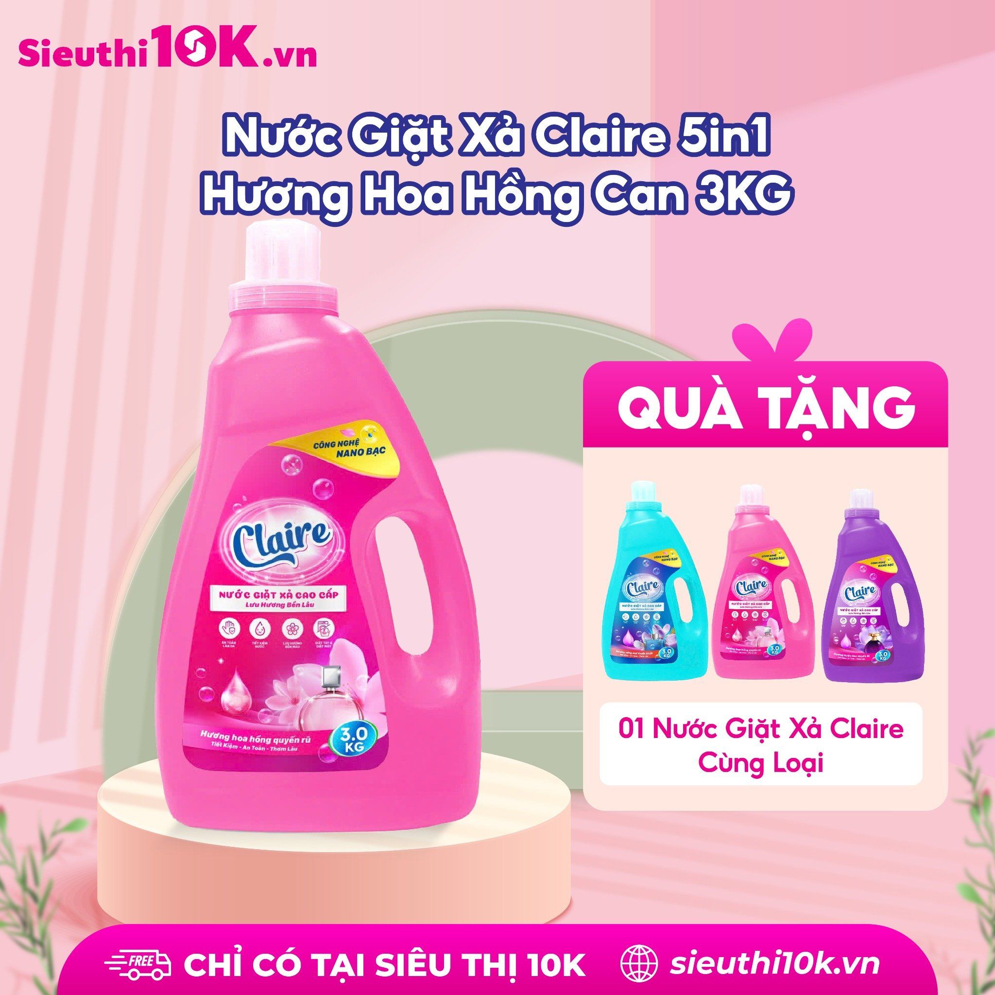 Tên sản phẩm: Nước Giặt Xả Claire 5in1 3kg Thành phần: Nước, Sodium Laureth Sufate, Sodium Lauryl benzene suffonate (Las), HEC-Hydroxy etyl celluto, Sodium tripolu phosphat, màu, hương, Nano Bạc,.... Nguyên liệu nhập khẩu từ Pháp. Nước giặt Clair là sản phẩm sản xuất theo công thức độc quyền, phân phối độc quyền tại hệ thống của Miniti. Không thể mua được ở bất cứ đâu. Được sản xuất theo công nghệ Nano Bạc: Công dụng: – Giúp tăng hiệu quả giặt giũ quần áo. – Giảm nguồn năng lượng tiêu thụ do những sản phẩm nước giặt xả này có thể giặt ở nhiệt độ thấp. – Tiết kiệm thời gian giặt giũ do hiệu quả phân huỷ vết bẩn dễ dàng. – Tiết kiệm nước do quá trình giặt giũ nhanh chóng. – Giảm tác động đến môi trường vì những enzyme này có khả năng phân huỷ sinh học. – Tăng độ trắng sáng và chống các chất bẩn bám trở lại trên quần áo. – Làm mới, giữ màu quần áo nhờ tác dụng của enzyme xenllulaza. – An toàn tuyệt đối cho da nhạy cảm, da trẻ nhỏ. Hướng dẫn sử dụng: Giặt tay: - Xả quần áo qua với nước sạch trước - Hòa tan 1 lượng vừa đủ nước giặt Claire trong 3-4 lít nước sạch. - Ngâm quần áo từ 10-15 phút - Vò, xả vải vài lần bằng nước sạch Giặt máy: Dùng 1-3 nắp tùy lượng quần áo cần giặt Chú ý: - Rửa tay sau khi sử dụng sản phẩm - Để tránh xa tầm tay trẻ em - Bảo quản sản phẩm ở nơi thoáng mát